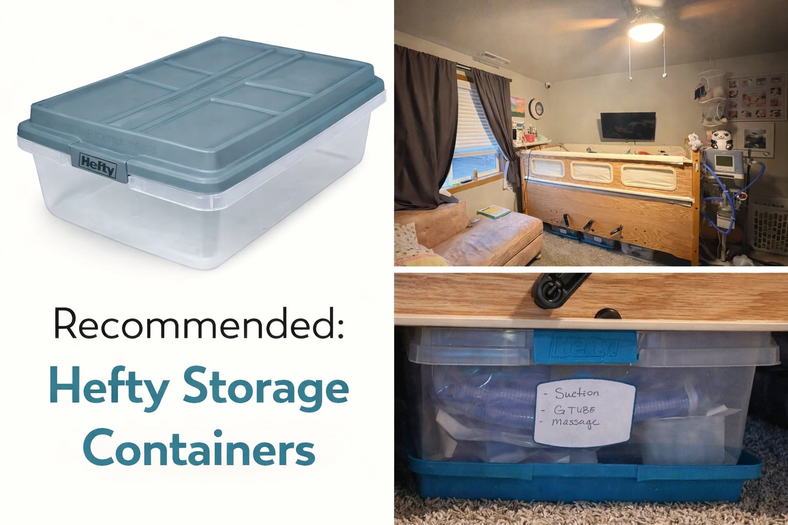 These Hefty Hi-Rise 40qt totes fit perfectly under the SleepSafe bed that insurance bought for my daughter. Currently, we have three totes under her bed, and they hold items for her cpap/bipap, nebulizer, suction, and more.